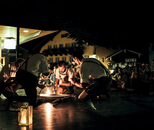 Am Marktplatz in Wagrain finden regelmäßig die traditionellen Heimat- & Brauchtumsabende inklusive Ausschank statt. An diesen netten Abenden stellen die Volkstanz- und Schuhplattlergruppe Wagrain mit Leidenschaft ihr Können unter Beweis. An einigen Abenden sind auch die Wagrainer "Herreiter" & "Goaßlschnalzer" mit dabei. Goaßlschnalzen ist ein österreichischer Brauch. Der Name erklärt sich aus der Bezeichnung für die Fuhrmannspeitsche, im Dialekt Goaßl. Schnalzen bezeichnet das durch die schnelle Bewegung entstehende laute Knallen mit der Peitsche. Genießt die Abende bei freiem Eintritt und Ausschank.