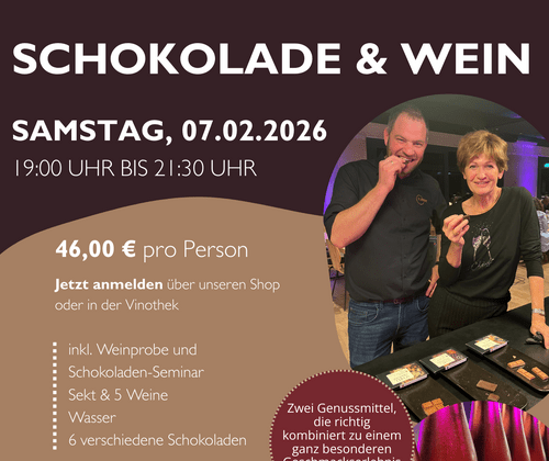 Genießen Sie verführerische Kombinationen der Schokoladenmanufaktur Schell und dem Weingut Klenert. inkl. Weinprobe und Schokoladen-Seminar Moderation: David Klenert und Martina Bieringer Schokolade & Wein das besondere Geschmackserlebnis Zwei Genussmittel, die richtig kombiniert zu einem ganz besonderen Geschmackserlebnis führen. Wann: Samstag, 07.02.2026 Uhrzeit: 19:00 Uhr bis 21:30 Uhr 46,00€ pro Person inkl. Weinprobe und Schokoladen-Seminar Moderation: David Klenert und Martina Bieringer Hinweis: Zum neutralisieren der Geschmacksnerven wird Baguette angeboten. Es wird sonst kein weiteres Essen geben. Zum Wohle der Umwelt verzichten wir auf den Versand von Eintrittskarten. Nach der Buchung erhalten Sie von uns eine Bestätigungsmail, welche für die Anmeldung am Abend ausreichend ist.