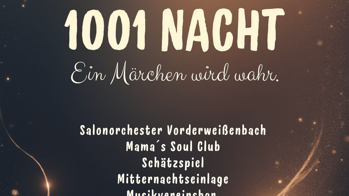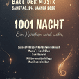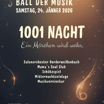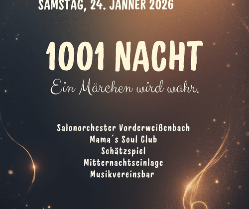 1001 Nacht - Ein Märchen wird wahr. Samstag, 24. Jänner 2026 Beginn: 20:00 Uhr, Einlass: 19:30 Uhr Schmankerlwirt in Vorderweißenbach VA: Musikverein Vorderweißenbach Salonorchester Vorderweißenbach Mama´s Soul Club Schätzspiel Mitternachtseinlage Musikvereinsbar Kartenvorverkauf bei den Musiker:innen