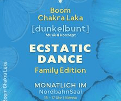 Boom Chakra Laka's Tanzritual Ecstatic Dance Family Edition, ist ein offener Tanzraum für Erwachsene, Familien und Kinder ab 6 Jahren, lädt zu einem besonderen Samstagnachmittag im NordbahnSaal in Wien ein. Zu einer sorgsam kuratierten Mischung aus Live-Musik und DJ-Sets von Ulf Lindemann alias [dunkelbunt] bewegen sich Teilnehmende frei, mal ausgelassen, mal sanft, allein oder zusammen.