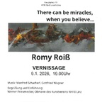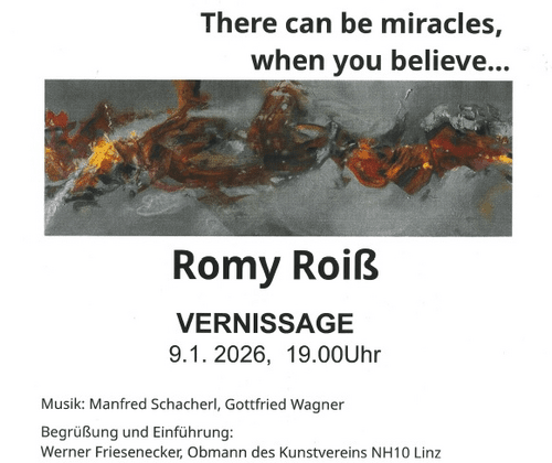 There can be miracles, when you believe... Romy Roiß Vernissage 9.1.2026, 19.00 Uhr LEO Kultur Bad Leonfelden Hauptplatz 19, 4190 Bad Leonfelden Musik: Manfred Schacherl, Gottfried Wagner Begrüßung und Einführung: Werner Friesenecker, Obmann des Kunstvereins NH10 Linz Ausstellung 1.1.-27.3.2026 Öffnungszeiten: 9:00-12:00, 14:00-17:00 Uhr