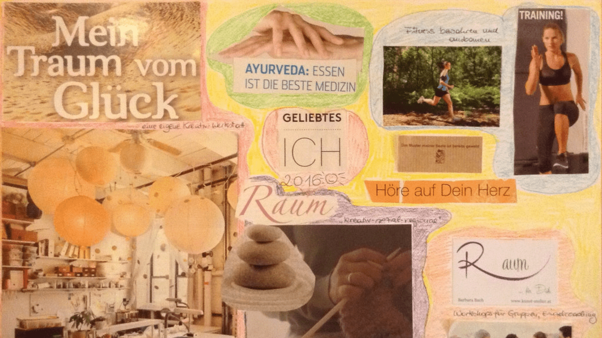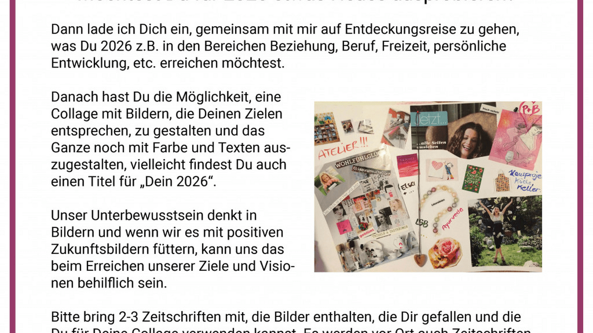 Danach hast Du die Möglichkeit, eine Collage mit Bildern, die Deinen Zielen entsprechen, zu gestalten und das Ganze noch mit Farbe und Texten auszugestalten, vielleicht findest Du auch einen Titel für „Dein 2026".