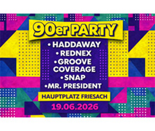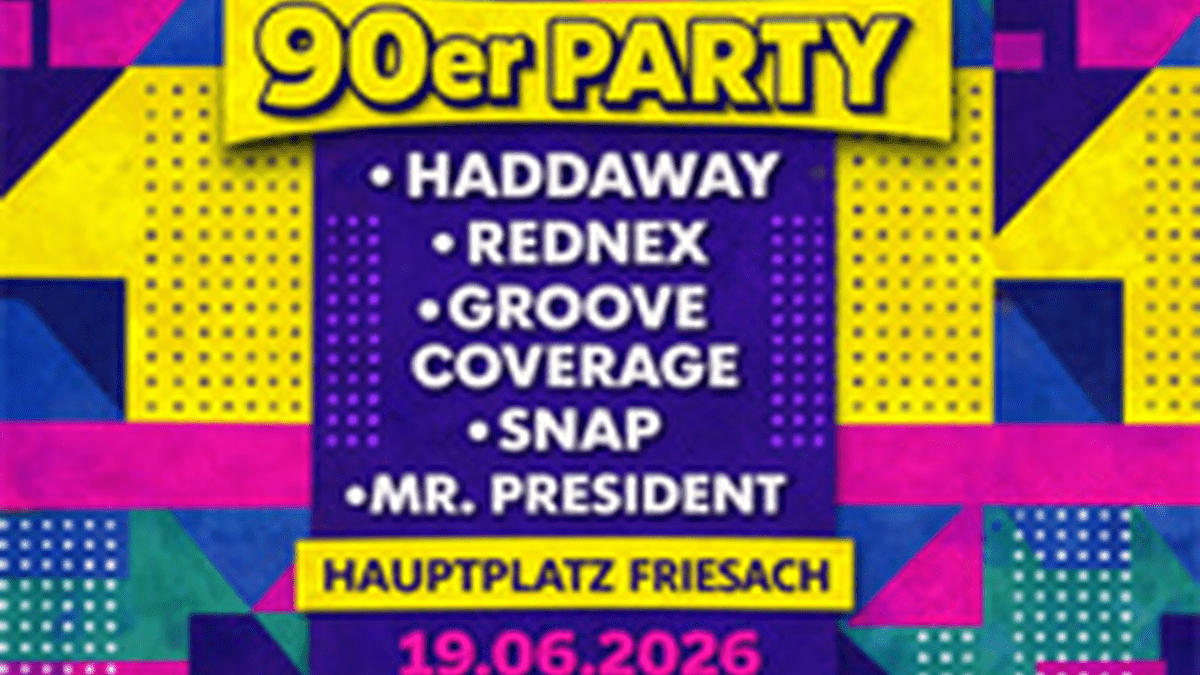 Am 19. Juni 2026 verwandelt sich der Hauptplatz Friesach in eine riesige Open-Air-Dancefloor-Zone und katapultiert euch direkt zurück in die legendären 90er-Jahre! Das wird die Party des Jahres in Kärnten!