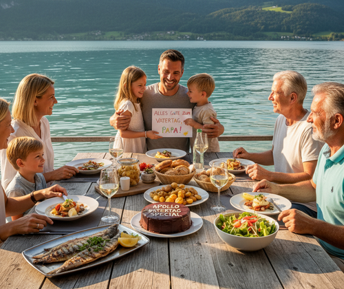 Zum Vatertag servieren wir Ihnen das perfekte Duo für Genießer: Freuen Sie sich auf unsere knusprig gebratene Stelze und frisch gezapftes Bier vom Holzfass. Ob als Belohnung nach einem Ausflug oder als gemütliches Beisammensein - wir bieten den idealen Treffpunkt für alle Väter und ihre Crews direkt an der Seepromenade. For Father's Day, we serve you the perfect duo for connoisseurs: look forward to our crispy roasted knuckle of pork and freshly tapped beer from the wooden barrel. Whether as a reward after an excursion or as a cozy get-together - we offer the ideal meeting place for all fathers and their crews directly on the lake promenade;