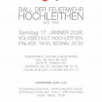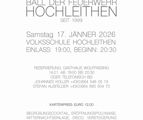 Wir laden Sie recht herzlich zu unserem Feuerwehrball am 17. Jänner 2026 ein. Neben zahlreichen kulinarischen Schmankerln unseres Ballwirts und Highlights aus den Weingärten Hochleithens erwartet Sie auch ein umfangreiches Rahmenprogramm!