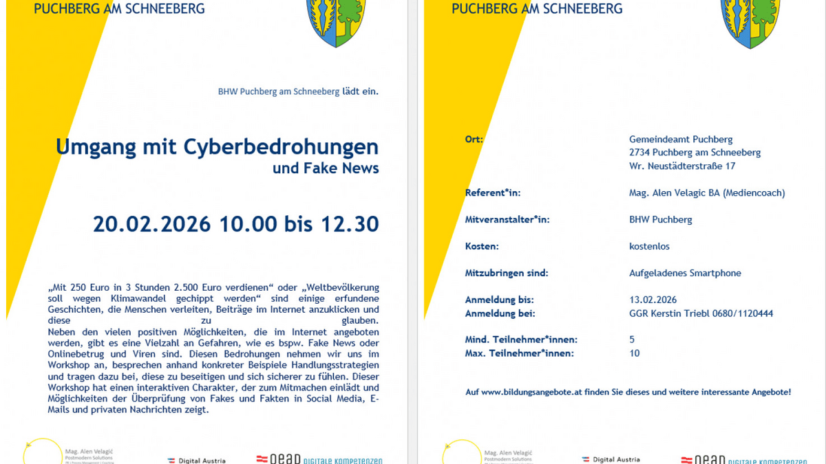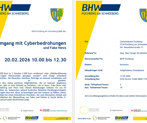 Neben den vielen positiven Möglichkeiten, die im Internet angeboten werden, gibt es eine Vielzahl an Gefahren, wie es bspw. Fake News oder Onlinebetrug und Viren sind. Diesen Bedrohungen nehmen wir uns im Workshop mit Frau Mag. Alen Velagic BA (Mediencoach) an, besprechen anhand konkreter Beispiele Handlungsstrategien und tragen dazu bei, diese zu beseitigen und sich sicherer zu fühlen. Dieser Workshop hat einen interaktiven Charakter, der zum Mitmachen einlädt und Möglichkeiten der Überprüfung von Fakes und Fakten in Social Media, E-Mails und privaten Nachrichten zeigt.
