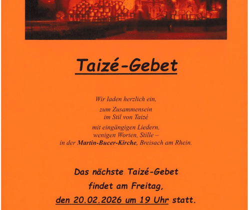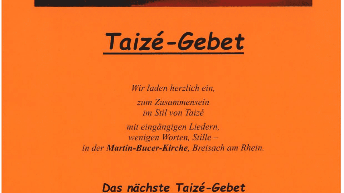 Taizé - Gebet in der Martin - Bucer - Kirche, Breisach am Rhein Wir laden herzlich ein, zum Zusammensein im Stil von Taizé mit eingängigen Liedern, wenigen Worten, Stille - immer am dritten Freitag im Monat um 19:00 Uhr in der Martin-Bucer-Kirche, Breisach am Rhein. Wir freuen uns auf Ihr / Euer kommen