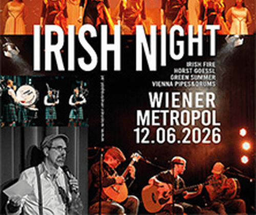 Den Auftakt macht die großartige Irish Folk Band Green Summer, gefolgt von einem stepptänzerischen Feuerwerk der hervorragenden Dance-Formation Irish Fire. Die imposante Dudelsackgruppe Vienna Pipes & Drums wird irische Stücke darbieten und einen musikalischen Ausflug nach Schottland machen, woraufhin Horst Gössl mit dem Publikum gemeinsam singend und klatschend das Wiener Metropol in ein Irish Pub mit authentischem „Temple Bar Feeling“ verwandelt.