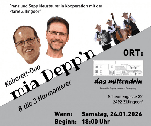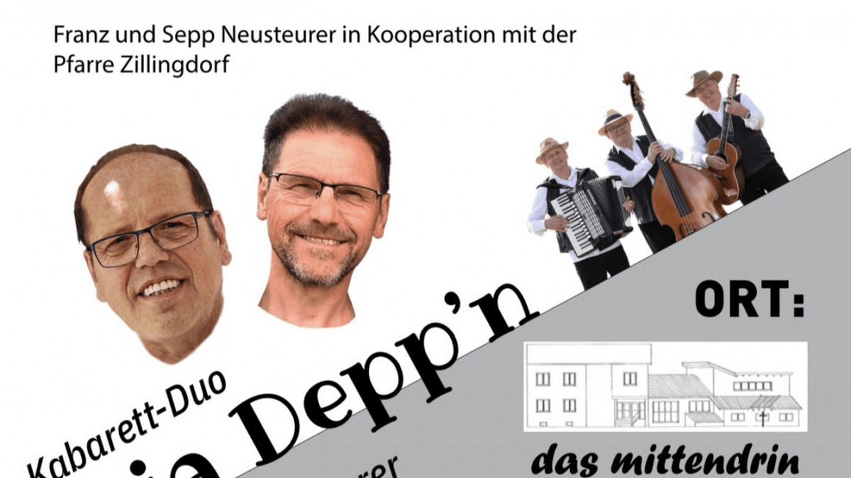 Das aktuelle unterhaltsame Kabarettprogramm „Wer braucht scho an Wiener“ des burgenländischen Kabarett-Duos „mia Depp‘n“ mit musikalischer Untermalung durch die „3 Harmonierer“.