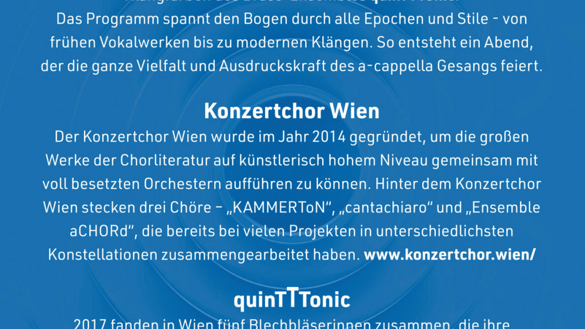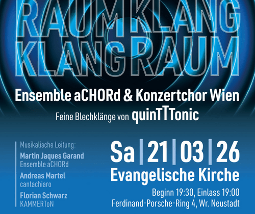 Beim Chorevent des Jahres 2026 vereinen das Ensemble aCHORd und der Konzertchor Wien ihre Stimmen zu einem außergewöhnlichen musikalischen Erlebnis – begleitet und kontrastiert von den brillanten Klangfarben des Brass-Ensembles quinTTTonic.