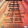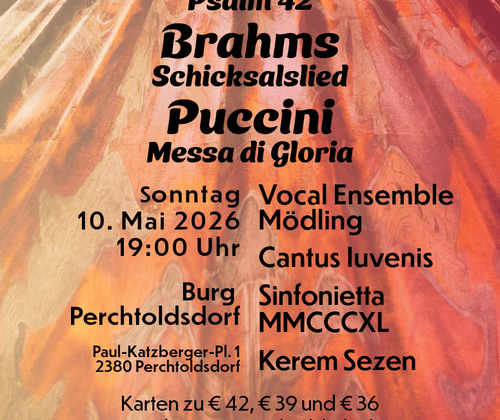 Das Vocal Ensemble Mödling lädt zu einem außergewöhnlichen Konzert ein, das drei Meisterwerke der Romantischen Musik vereint: Johannes Brahms’ ergreifendes „Schicksalslied“, Felix Mendelssohns kraftvoll-leidenschaftlichen Psalm 42 „Wie der Hirsch schreit“ sowie Giacomo Puccinis strahlende „Messa di Gloria“. Ergänzt wird das Konzert durch ausgewählte Lieder von Robert Schumann.