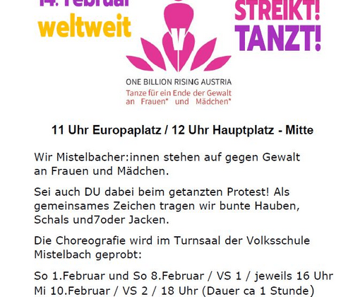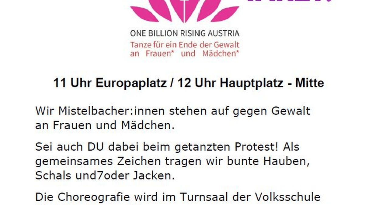 Rund um den 14. Februar findet weltweit jährlich "One Billion Rising" statt. Diese Initiative setzt sich als getanzter Protest für ein Ende der Gewalt gegen Frauen und Mädchen ein. Auch in Mistelbach wird getanzt und alle sind herzlich dazu eingeladen!