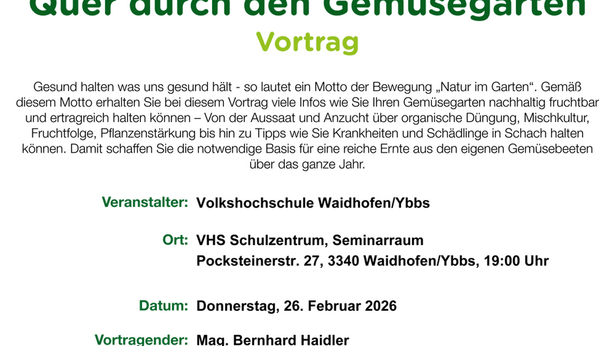 Mag. Haidler erklärt, wie ein Gemüsegarten nachhaltig fruchtbar und ertragreich gehalten werden kann. Besucherinnen und Besucher erfahren Wissenswertes von der Aussaat und Anzucht von Gemüse über organische Düngung, Mischkultur und Fruchtfolge bis zur vorbeugenden Pflanzenstärkung. Zahlreiche Tipps wie Krankheiten und Schädlinge in Schach gehalten werden können und so die notwendige Basis für eine reiche Ernte aus den eigenen Gemüsebeeten geschaffen werden kann.