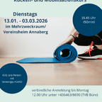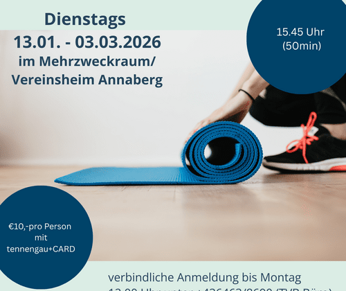 Fit durch den Winter Rücken und Mobilisationskurs Dienstag 13.01.2026 - 03.03.2026 im Mehrzweckraum Vereinstheim Annaberg 10 pro Person bitte Anmelden bis zum Vortag (Montag) bis 12 Uhr !!! unter +43 6463/ 8690 (TVB Büro) mit Gitti Quehenberger Körperzeit