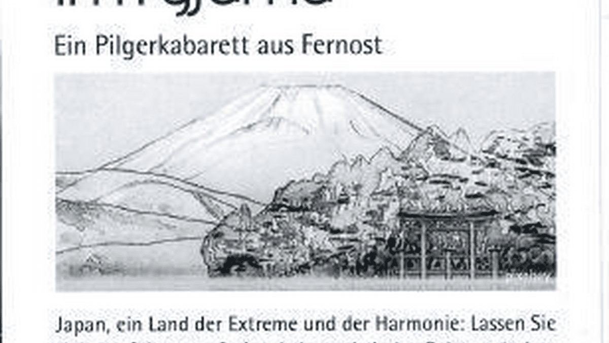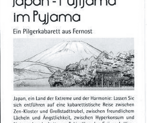 Freiwilliger Beitrag Ein Pilgerkabarett aus Fernost Japan, ein Land der Extreme und der Harmonie: Lassen Sie sich entführen auf eine kabarettistische Reise zwischen Zen-Kloster und Großstadttrubel, zwischen freundlichem Lächeln und Ängstlichkeit, zwischen Hyperkonsum und Naturverbundenheit, von Tokio über den Fuji nach Hiro­shima, Nara und Kyoto. „Konichiwa!“ auf einer lustigen Familienpilgerreise ins Land der aufgehenden Sonne. Wir tauchen in das japanische Leben ein – und kommen mit­ten im eigenen an. Mit viel Humor, Bildern und Tiefgang begegnen wir fremder Kultur in uns selbst.