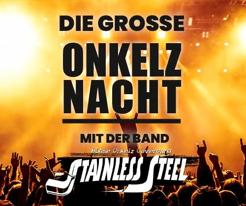 Erleben Sie die größten Hits der Böhsen Onkelz gespielt von der besten Onkelz Coverband Stainless Steel live in Tuttlingen und genießen Sie einen einzigartigen Abend voller Onkelz Musik!!! Stainless Steel "Die beste Onkelz Coverband der Welt" Ob als Supportband beim „Vaya Con Tioz“-Festival der “Böhsen Onkelz” am Eurospeedway Lausitzring vom 15.-18.06.2005 und in dessen Folge bei regelmäßigen Auftritten vor mehreren tausend Zuschauern, zum Beispiel bei Veranstaltungen des seinerzeit offiziellen „Böhse Onkelz“-Fanclubs „B.O.S.C.“, wie dem „B.O.S.C. Rocks“-Festival in Schwarzheide, der „27 Jahre Böhse Onkelz“-Geburtstagsparty in der Frankfurter Ballsporthalle oder dem „Onkelz Non Stop“-Event im Eventzentrum Geiselwind oder auch bei Großveranstaltungen wie „Wacken Rocks South“ bzw. dem alljährlichen „G.O.N.D.“-Festvial, wo „Stainless Steel“ nebenbei bemerkt die inzwischen einzige Band ist, die seit Anfang an jährlich dieses Szenetreffen vor mittlerweilen rund 20.000 Menschen bespielt – die Band blickt auf eine ziemlich lange und aufregende Historie zurück und konnte sich dank hervorragender Live-Qualitäten, unbändiger Spielfreude und energiegeladener Bühnen-Show mit über 12 Jahren Bühnenpräsenz .