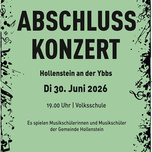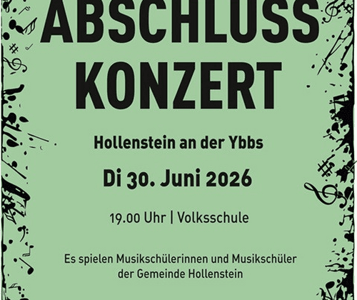 Am Dienstag 30. Juni findet im Schulzentrum Hollenstein an der Ybbs das Abschlusskonzert der Zweigestelle Hollenstein der Musik- und Kunstschule Waidhofen/Ybbstal statt. Schülerinnen und Schüler der Gemeinde spielen ein abwechslungsreiches Programm von verschiedenen Solisten, Vocal- und Instrumentalensembles.