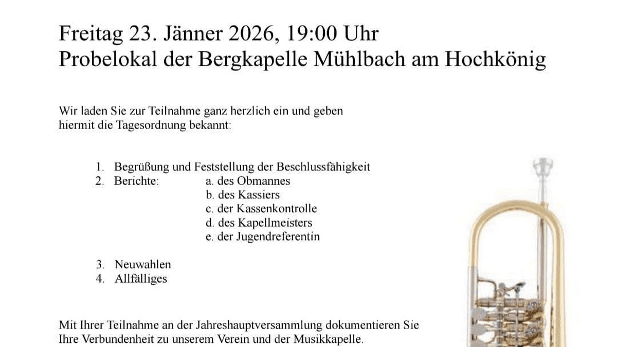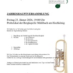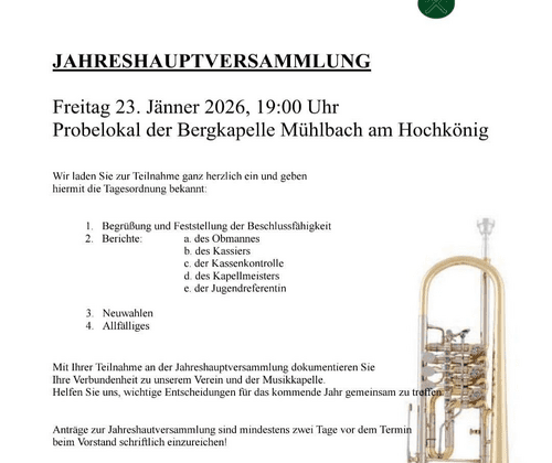 Jahreshauptversammlung der Bergkapelle Mühlbach 19:00 Uhr