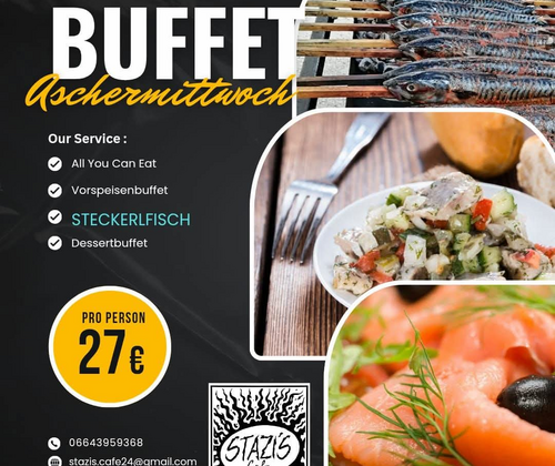 Das Fischbuffet im Stazi's Café in Spital am Pyhrn ist genau das Richtige für Genießer! VorspeisenbuffetSteckerlfischDessertbuffetAll You can eat und auch zum Mitnehmen