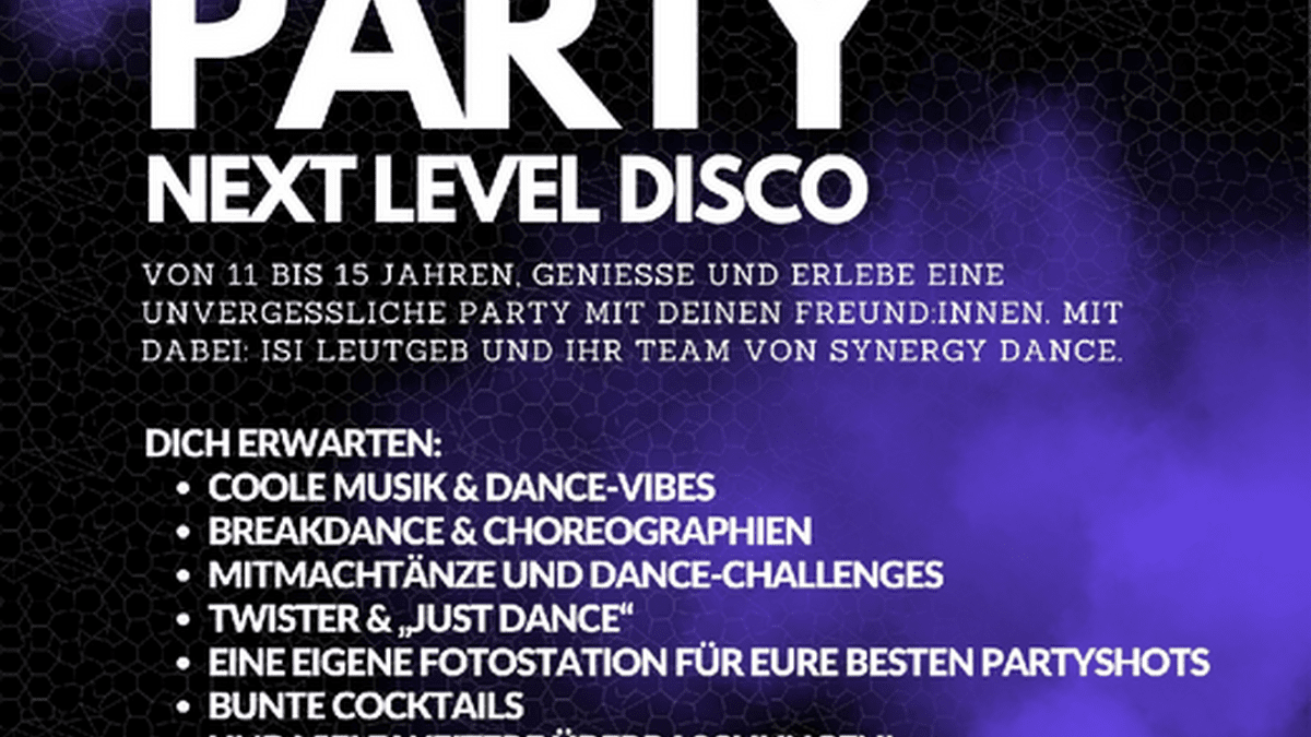 Next Level Disco 16. Februar 2026 | 18-21 Uhr von 11 bis 15 Jahren, genieße und erlebe eine unvergessliche Party mit deinen Freund:innen mit dabei: Isi Leutgeb und ihr Teram von Synergy Dance Dich erwarten: coole Musik & Dance-Vibes Breakdance & Choreographien Mitmachtänze und Dance-Challenges Twister "Just Dance" eine eigene Fotostation für eure besten Partyshots bunte Cocktails und viele weitere Überraschungen