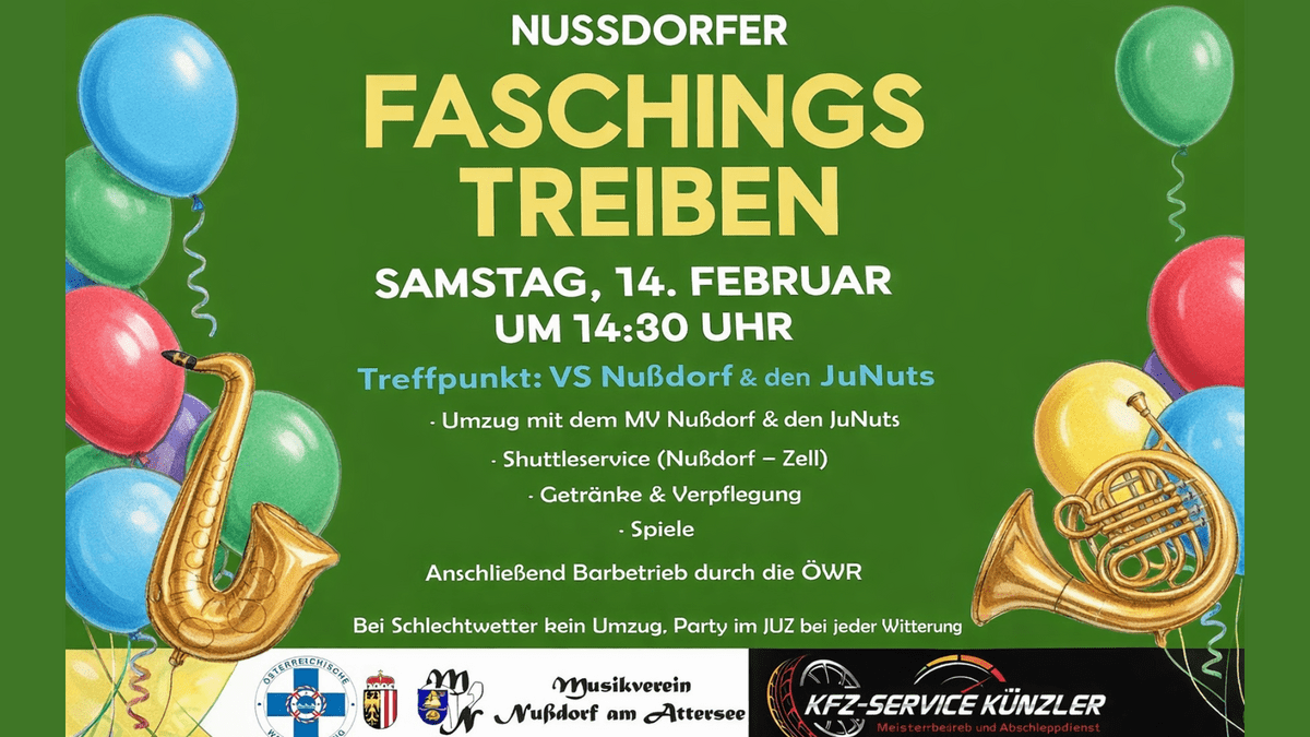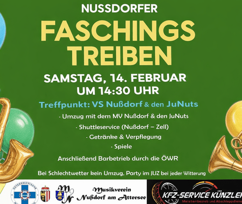 Der Nußdorfer Faschingsumzug findet am Samstag, dem 14.02.2026, statt und startet um 14:30 Uhr. Der bunte Umzug beginnt bei der Volksschule Nußdorf am Attersee und führt über den Reiterweg bis zum Jugendzentrum (Seepoint 1a). Es handelt sich um einen Faschingsumzug ohne Wägen, der als fröhlicher Fußmarsch mit musikalischer Begleitung gestaltet ist. Für das leibliche Wohl ist bestens gesorgt – feiern Sie gemeinsam Fasching, Spaß und gute Stimmung in Nußdorf am Attersee.