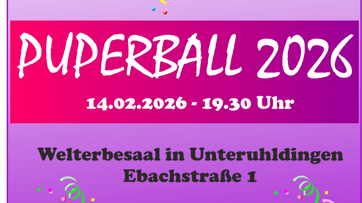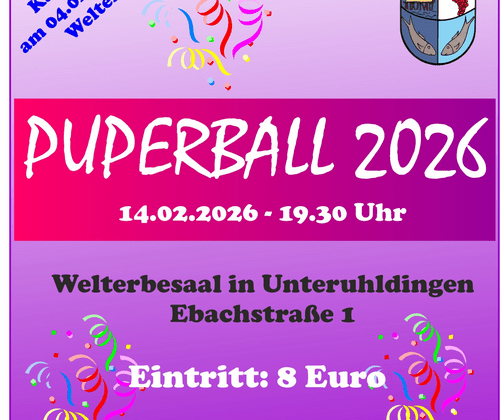 Puperball... am 14. Februar 2026 ab 19.30 Uhr im Welterbesaal in Unteruhldingen (Ehbachstraße 1, 88690 Uhldingen-Mühlhofen) Die fünfte Jahreszeit ist da! Der Narrenverein Puper Unteruhldingen e. V. laden dich herzlich zu ihrem Puperball ein. Freue dich auf bunte Kostüme, gute Musik, ausgelassene Stimmung und einen unvergesslichen Abend. Die Unteruhldinger Narren freuen sich auf Euer Kommen!