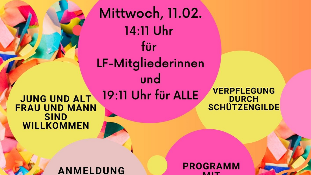 Närrischer Nachmittag UND Abend im Schützenhaus Herzliche Einladung an alle, die kommen wollen Die Landfrauen planen im Schützenhaus Lauf wieder einen unterhaltsamen Nachmittag und – zum erstem Mal - auch einen Abend. Bei Live-Musik wird in lockerer Runde geschunkelt, gesungen und gelacht, kein Auge bleibt bei dem bunten, närrischen Programm trocken. Für das leibliche Wohl sorgt das Team der Schützengilde. Vor der Nachmittagsvorstellung wird Kaffee und Kuchen angeboten. Zum Ende haben alle Gäste die Möglichkeit, sich bei den kulinarischen Köstlichkeiten der Schützengilde zu stärken. Auch die Besucher und Besucherinnen der Abendveranstaltung können bei der Schützengilde ihren Hunger stillen. Veranstaltung Nachmittag: 14:11 Uhr Anmeldung bei Maria Rummel, Tel. 9755 Veranstaltung Abend: 19:11 Uhr Anmeldung durch Kartenvorverkauf Die Karten für den Abend gibt es bei Doris Steimel, Kistenbühnstr. 2, und bei Simone Graf, tagsüber Bäckerei Graf, Schloßstraße Einfach telefonisch oder durch Karte anmelden und frohe Stunden im Schützenhaus genießen. Die LandFrauen und das „Versorgungsteam“ der Schützengilde freuen sich auf zahlreiche Gäste.