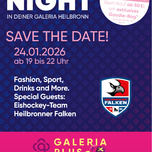 Late-Night-Shopping, besondere Highlights und die Heilbronner Falken live vor Ort - ein Abend zum Genießen, Entdecken und Erleben. Am 24.01.2026 laden wir Sie herzlich zu unserer exklusiven Ladies Night ein. Freuen Sie sich auf einen besonderen Shopping-Abend in stilvoller, liebevoll gestalteter Atmosphäre. Genießen Sie entspanntes Late-Night-Shopping, entdecken Sie attraktive Angebote und lassen Sie sich von besonderen Highlights überraschen. Ein besonderes Highlight des Abends: Das Eishockeyteam der Heilbronner Falken ist live vor Ort. Nutzen Sie die Gelegenheit für persönliche Begegnungen, Autogramme und Erinnerungsfotos. Ob mit Freund*innen, Kolleg*innen oder als Team - die Ladies Night bietet den perfekten Rahmen für einen gelungenen Abend voller Inspiration, Begegnungen und Shoppingvergnügen. Wir freuen uns darauf, diesen besonderen Abend gemeinsam mit Ihnen zu erleben.