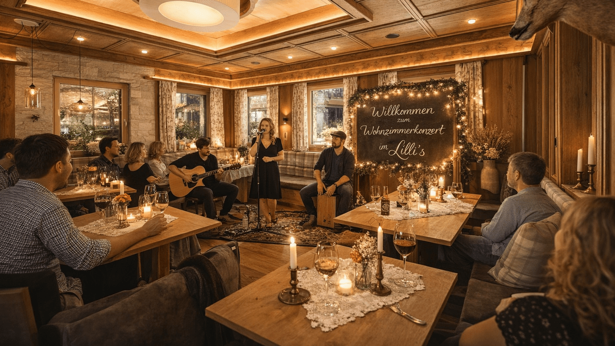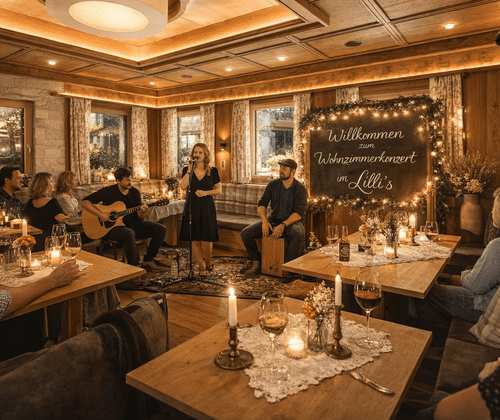 Wenn Musik auf Gemütlichkeit trifft, entsteht etwas ganz Besonderes: Das Wohnzimmerkonzert bei Lilli’s lädt zu einem Abend voller Wärme, Nähe und echter Emotionen ein. In entspannter Atmosphäre, umgeben von Kerzenlicht und herzlicher Gastfreundschaft, wird Live-Musik zum persönlichen Erlebnis. Künstlerinnen und Künstler spielen ganz nah am Publikum, während feine Kulinarik und alpine Gemütlichkeit den Rahmen für einen unvergesslichen Abend schaffen. Ein Wohnzimmerkonzert bei Lilli’s ist kein großes Event, sondern ein echtes Gefühl von Ankommen, Zuhören und Genießen.