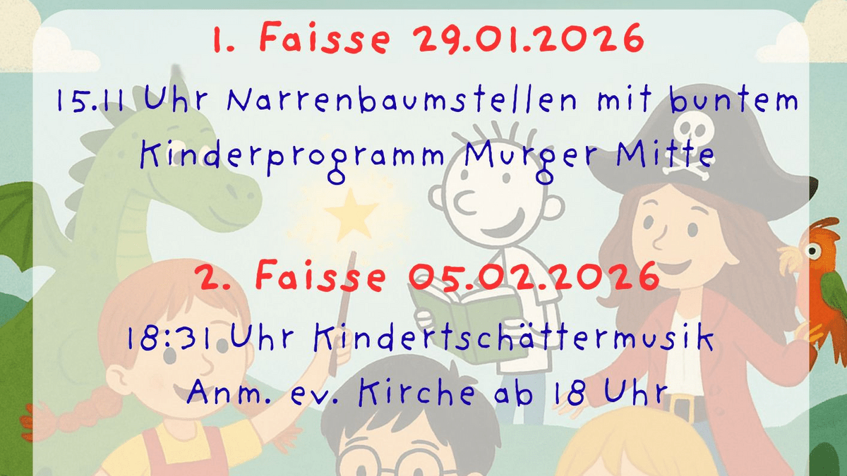 Das Motte der Kinderfasnacht 2026 lautet: "In Murg an Fasnacht singt und lacht, wer als Buchheld Freude macht." Kinderfasnacht am 3. Faißen – seid dabei! Am 3. Faiße - dem schmutzige Dunnschtig - ist Murg fest in närrischer Hand! Die Narrenzunft lädt alle kleinen und großen Narren zum kunterbunten Kinderumzug und fröhlichen Kinderball ein. Los geht’s um 14:11 Uhr – Aufstellung ist ab 13:30 Uhr beim Spielplatz in der Hauensteiner Straße. Von dort schlängelt sich der Umzug durch die Langmattstraße bis zur Murgtalhalle zum Start des Kinderballs. Verkleidet euch, kommt vorbei und feiert mit!