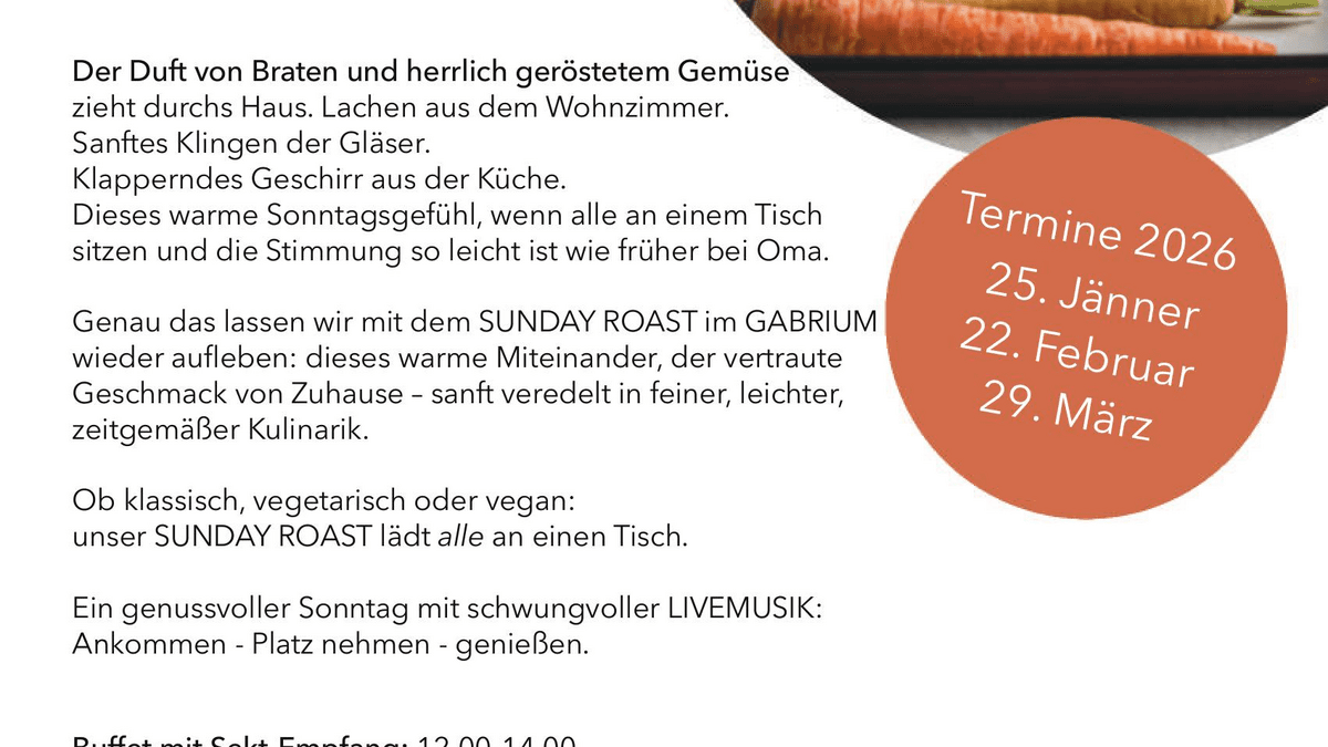 Wir lassen mit dem SUNDAY ROAST den SONNTAGSBRATEN im GABRIUM wieder aufleben: dieses warme Miteinander, der vertraute Geschmack von Zuhause –sanft veredelt in feiner, leichter, zeitgemäßer Kulinarik. Ob klassisch, vegetarisch oder vegan, unser SUNDAY ROAST lädt alle an einen Tisch.