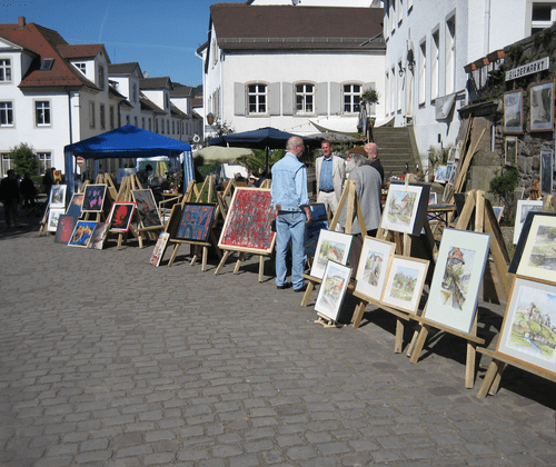 Zahlreiche Künstler und Kreative zeigen plain air ihre Werke, diskutieren und arbeiten gemeinsam. In entspannter Atmosphäre könnt Ihr bei einem Gläschen Wein und Live-Musik mit Pete Alderton unter Palmen das Montmartre-Gefühl in Hessens französischster Stadt genießen.