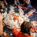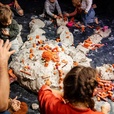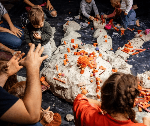 Zwei Performerinnen und eine Musikerin öffnen einen performativen Raum und laden das Publikum ein mit ihnen zu formen und zu verändern. Mit der Performance HÄNDE öffnen wir einen Raum für Begegnung. Das Publikum trifft auf die Performerinnen und das Material auf der Bühne. Dabei wird dem sehr jungen Publikum ermöglicht mit allen Sinnen zu erleben und Teil der Performance zu sein. Dieses Teilnehmen ist zum Großteil selbstbestimmt. Manche Kinder bleiben während der gesamten Vorstellung auf ihren Plätzen und beobachten, andere wiederum verlassen ihre Sitzplätze, nähern sich an und interagieren mit den Performerinnen.