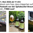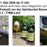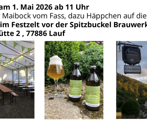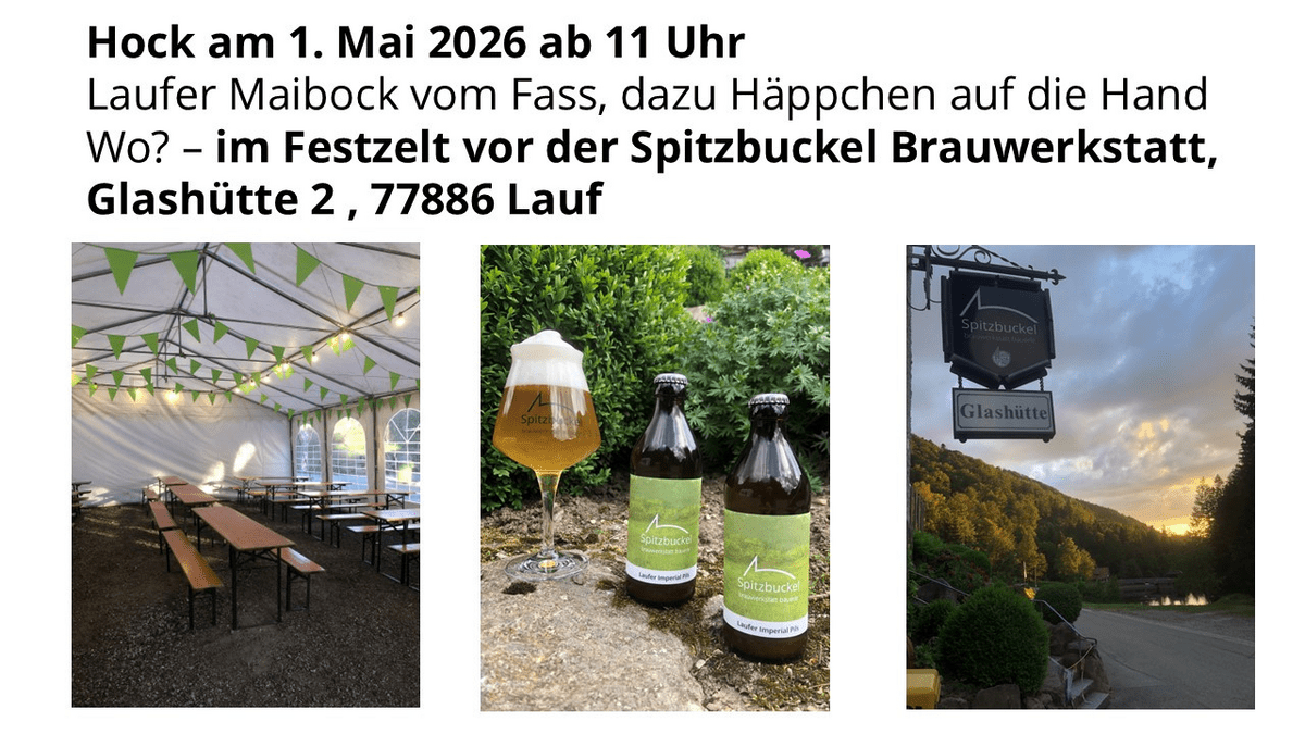 1. Mai Hock am Spitzbuckel Am 1. Mai in die Glashütte wandern und einen frischen Spitzbuckel Maibock vom Fass genießen. Die übrigen Spitzbuckelbiere und alkoholfreie Getränke sind ebenfalls im Ausschank. Für Speisen ist gesorgt. Es gibt wieder unsere Häppchen auf die Hand. Venezianische Spezialitäten - badisch interpretiert. Unsere Brauwerkstatt liegt am Ende des Laufbachtals im Laufer Ortsteil Glashütte. Sanft eingebunden in die Tallandschaft des Nordschwarzwaldes, in unmittelbarer Nähe zum Stausee, am Fuße des Spitzbuckels. Hier am Spitzbuckel entspringt auch die Spitzbuckelquelle, deren weiches Gebirgsquellwasser die optimale Grundlage für unsere genussvollen Biere ist. Unter weiterer Verwendung von hochwertigsten Rohstoffen, brauen wir handwerklich traditionelle Biere nach dem deutschen Reinheitsgebot von 1516. Wir verwenden Malze aus der Region und hochwertigen Hopfen. Gleichzeitig legen wir großen Wert auf die verwendeten Hefekulturen. Nach der Hauptgärung werden unsere Biere ungefiltert abgefüllt. Nun erfolgt die zweite Gärung als Flaschengärung. So wird jede Flasche zum Unikat. Vor dem Genuss erhält jedes Bier eine lange Reifezeit, um zu einem besonderen Geschmackserlebnis zu werden. Wir freuen uns auf Euch.