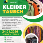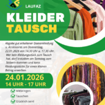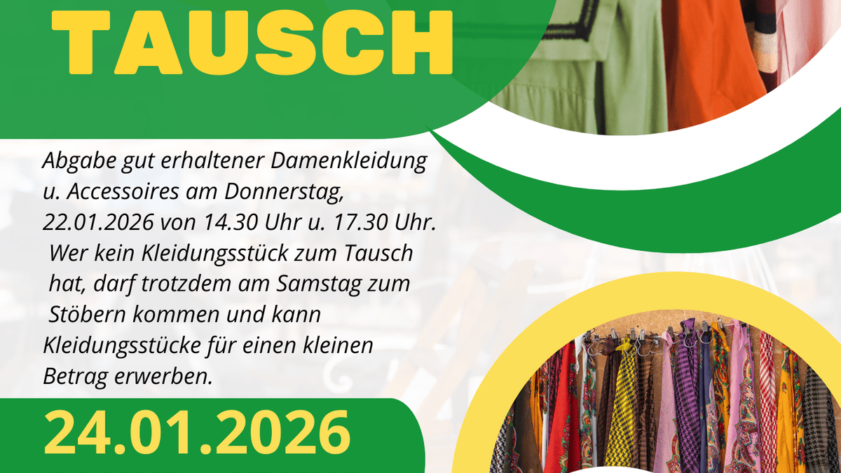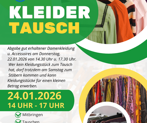 Kleidertausch Mitbringen - Tauschen - Glücklich sein Abgabe gut erhaltener Damenkleidung und Accessoires am: Donnerstag, 22.01.26, von 14:30 Uhr bis 17:30 Uhr. Wer kein Kleidungsstück zum Tausch hat, darf trotzdem am Samstag, 24.01.2026, zum Stöbern kommen und kann Kleidungsstücke für einen kleinen Betrage erwerben. Es werden zudem alkoholfreie Cocktails und Snacks angeboten.