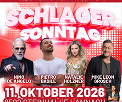 Am Sonntag, 11. Oktober 2026, verwandelt sich die Steinhalle Lannach (8502) in einen Treffpunkt für alle Schlagerfans. Unter dem Motto "Schlager Sonntag" präsentiert WATZ Entertainment ein hochkarätig besetztes Live-Event mit bekannten Stars der deutschsprachigen Schlagerszene.