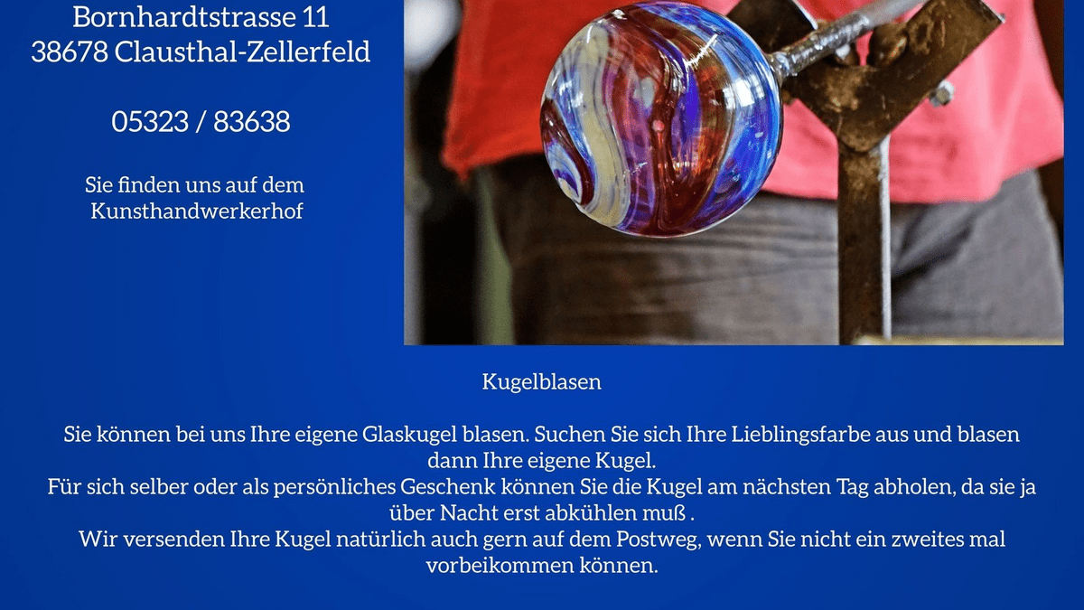 Sie können bei uns Ihre eigene Glaskugel blasen. Sie suchen sich Ihre Lieblingsfarbe aus und blasen dann Ihre eigene Kugel. Für sich selber oder als persönliches Geschenk… Da die Kugel über Nacht langsam abkühlen muss, kann diese allerdings erst am nächsten Tag abgeholt werden. Wir können sie allerdings auch gern auf dem Postweg zusenden. Eine Anmeldung hierfür ist auf jeden Fall erforderlich.