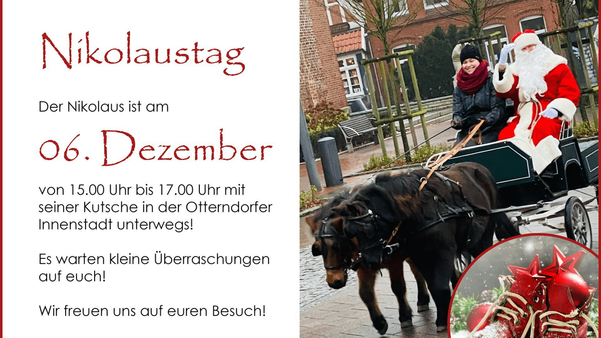 Nikolaustag Der Nikolaus ist am 06. Dezember von 15.00 Uhr bis 17.00 Uhr mit seiner Kutsche in der Otterndorfer Innenstadt unterwegs! Es warten kleine Überraschungen auf euch. Wir freuen uns auf euren Besuch! Kontakt: www.stadtmarketing-otterndorf.de  E-Mail: Imke.Luetjen@Otterndorf.de