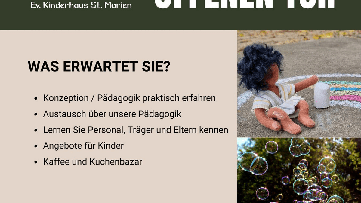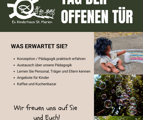 Öffentliche Einladung – Tag der offenen Tür Wir laden Sie herzlich zu unserem Tag der offenen Tür ein! Jedes Jahr am ersten Dienstag im Oktober. Lernen Sie unser Konzept kennen – nicht nur schauen, sondern selbst erleben und ausprobieren lautet die Devise. Ob Interesse an unserer Einrichtung, unserer Pädagogik oder unserem gesamten Konzept: Unsere Türen stehen für Sie offen! Kommen Sie vorbei, entdecken Sie unsere Angebote und kommen Sie mit uns ins Gespräch. Wir freuen uns auf Ihren Besuch!