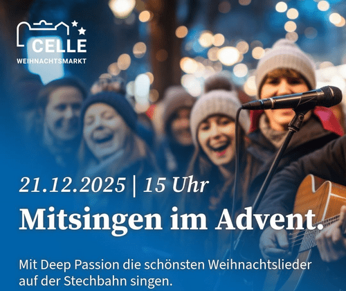 Der Advent ist die Zeit des Innehaltens, der Gemeinschaft und der Musik. Am Sonntag, 20.12., um 16:00 Uhr laden wir herzlich zum Mitsingen im Advent mit Deep Passion auf der Stechbahn ein. Freuen Sie sich auf stimmungsvolle Musik, bekannte Advents- und Weihnachtslieder und einen gemeinsamen musikalischen Moment unter freiem Himmel. Ob jung oder alt, mit oder ohne Gesangserfahrung – alle sind eingeladen mitzusingen oder einfach zu genießen. Kommen Sie vorbei, singen Sie mit und lassen Sie uns gemeinsam die Vorfreude auf Weihnachten teilen. 📍 Stechbahn 🕒 20.12. | 16:00 Uhr