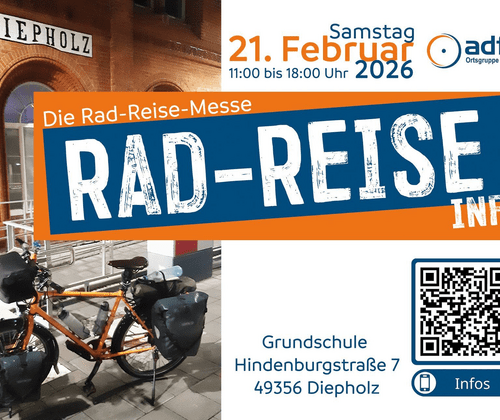 Nach dem großen Erfolg der RAD-REISE Info in 2024 lädt die ADFC Ortsgruppe wieder zur RAD-REISE Messe nach Diepholz ein. Dann werden die Räume der Grundschule an der Hindenburgstraße wieder ein Treffpunkt vieler Radfahrender bis weit über die Grenzen des Landkreises hinaus. Bei dieser Infoveranstaltung dreht sich alles ums Thema „Reisen mit dem Fahrrad“. Es wird Infostände und Workshops geben, von Navigation bis hin zu Anforderungen an Rad und Ausrüstung, sowie Bildervorträge über Radreisen im In- und Ausland. Egal ob weite Radreise oder eher ein Tagesausflug, ob „Amateure“ oder „Profis“, Radreisende, die ihre Urlaubserlebnisse vorstellen, Messestände zum Thema Radreiseplanung, Ausrüstung, Navigation, Unterkünfte, geführte Radreisen, individuelle Radreisen, Knotenpunktsystem, Touristikverbände und vieles mehr stehen auf dem Plan. In zwei gesonderten Räumen machen verschiedene Bildervorträge über Radreisen im In- und Ausland Lust auf ein spannendes Urlaubsabenteuer, klimafreundlich, aktiv, gesund und nebenbei recht kostengünstig. Zur RAD-REISE Info 2026 wird der ADFC Kreisverband Diepholz wieder eine Fahrrad-Codierung anbieten. Das eigens eingerichtete Café Bike lädt zum Verweilen und zu anregenden Fachgesprächen bei Getränken und Kuchen ein.