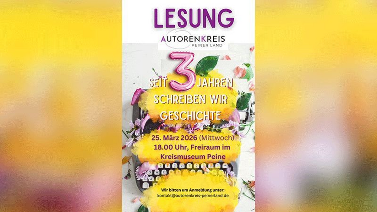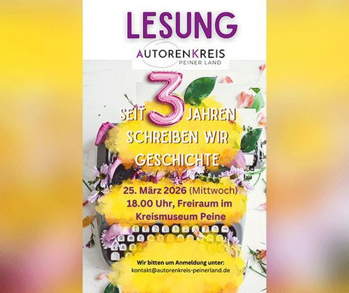 Seit drei Jahren bringt der Autorenkreis Schreibende aus der Region zusammen, fördert den literarischen Austausch und bereichert das kulturelle Leben im Peiner Land mit vielfältigen Texten und Veranstaltungen. Die Jubiläumslesung bietet eine abwechslungsreiche Auswahl aus unterschiedlichen Genres – von Kurzgeschichten über Lyrik bis hin zu erzählerischer Prosa. Freuen Sie sich auf einen literarischen Abend mit persönlichen Texten, spannenden Einblicken in das Schaffen der Autorinnen und Autoren sowie auf die Gelegenheit zum Austausch in angenehmer Atmosphäre. Feiern Sie mit uns drei Jahre Autorenkreis Peiner Land – literarisch, lebendig und regional. Wir freuen uns auf Ihr Kommen! Wir bitten um Anmeldung unter:  kontakt@autorenkreis-peinerland.de Veranstalter: Autorenkreis Peiner Land Berliner Str. 21 38268 Lengede