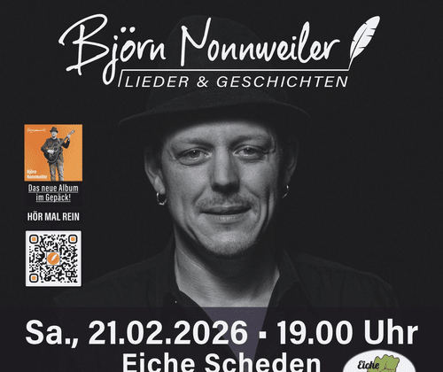 Lieder & Geschichten, die das Leben schreibt Björn Nonnweiler ist Liedermacher und Geschichtenerzähler. Seine Texte sind oft tiefsinnig und regen zum Nachdenken an. Die fröhlichen Seiten des Lebens lässt er nicht aus, und so finden hei­tere wie auch hoffnungsvolle Lieder einen Platz in seinem Repertoire. Auf charmante Art und Weise versteht es der Hagener Sänger und Gitarrist, sein Publikum in kürzester Zeit zu begeistern. Mit seinem brillanten Gitarrenspiel und seiner Stimme, die sich durch ein sanftes Timbre auszeichnet, singt und spielt er sich in die Herzen seiner Zuhörerinnen und Zuhörer. Immer ehrlich, authentisch und sich selbst treu. Nonnweiler singt für den Frieden, gegen Unrecht und gegen Gewalt und engagiert sich in der Friedensbewegung. 2009 belegte er den 3. Platz beim Singer-Songwriter Wettbewerb des internationalen Gitarrenfestivals „Open Strings“ in Osnabrück unter der Leitung von Peter Finger. 2010 folgte der 1. Platz beim bundesweiten Kreativwettbewerb „Songlive“, der von der Sängerakademie Hamburg ausgeführt wurde, unter der Schirmherrschaft von keinem geringeren als Heinz Rudolf Kunze. Björn Nonnweiler singt Lieder und erzählt Geschichten, die das Leben schreibt.