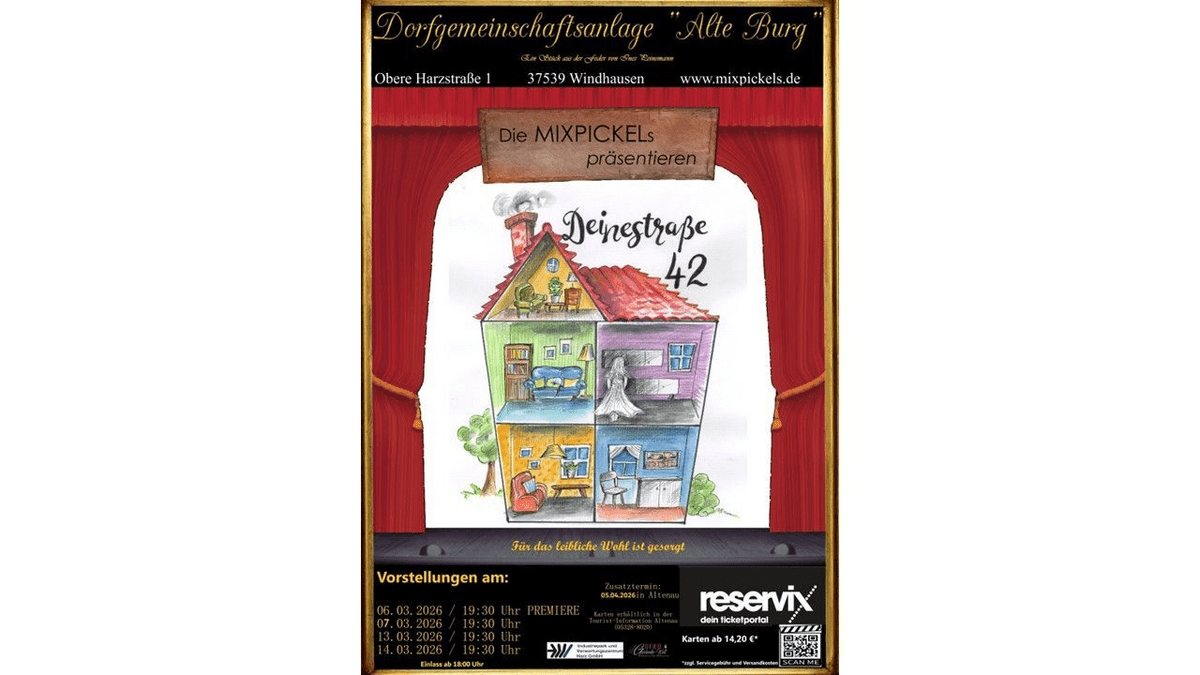 Die Tourist-Information Altenau lädt am 05.04.26 im Kurgastzentrum, zum neuen Stück der Theatergruppe MixPickels ein. "Deine Straße 42 - Ein ganz normales Haus?" heißt das neue Stück der Laientheatergruppe aber ist es wirklich ein ganz normales Haus oder geht es hier vielleicht nicht ganz mit rechten Dingen vor sich? Kommen Sie vorbei und finden es heraus! Kartenvorverkauf findet in den Tourist-Informationen Altenau und Clausthal-Zellerfeld statt. VVK: 15€ Abendkasse: 16€