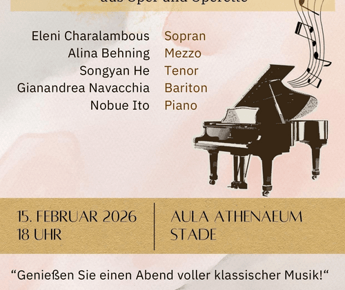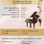 "Genießen Sie einen Abend voller klassischer Musik." Eleni Charalambous - Sopran Alina Behning - Mezzo Songyan He - Tenor Gianandrea Navacchia - Bariton Nobue Ito - Piano Tickets für 15,- Euro gibt es in der Buchhandlung Schaumburg oder über Africa (K)now e. V.