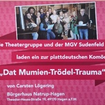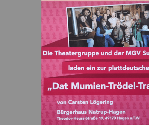 Die Theatergruppe des MGV Sudenfeld bringt in diesem Jahr das plattdeutsche Lustspiel „Dat Mumien-Trödel-Trauma“ von Carsten Lögering auf die Bühne. Der humorvolle Dreiakter mit viel Durcheinander verspricht beste Unterhaltung und lässt den Alltag für einige Stunden vergessen. Gespielt wird – wie in den vergangenen Jahren – im Bürgerhaus Natrup-Hagen.  Der Kartenvorverkauf startet am 17.01.2026 von 17:00 bis 19:00. Weitere Termine sind am  Sonntag den 18.01.2026  von 10:00 Uhr bis 11:30 Uhr , am Sonntag den 25.01.2026  von 10:00 Uhr bis 11:30 Uhr, am Sonntag den 01.02 .2026 von 10:00 Uhr bis 11:30 Uhr am Sonntag den 08.02 .2026 von 10:00 Uhr bis 11:30 Uhr am Sonntag den15.02 .2026 von 10:00 Uhr bis 11:30 Uhr   im Katholischen Kindergarten St. Marien in Gellenbeck. Weitere Karten sind ab dem 15. Februar auch vor den Aufführungen im Bürgerhaus erhältlich. Informationen zum Kartenvorverkauf gibt es bei Marion Glasmeyer (Tel. 05405 / 7870) oder Martin Dierker (Tel. 05405 / 8653).