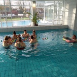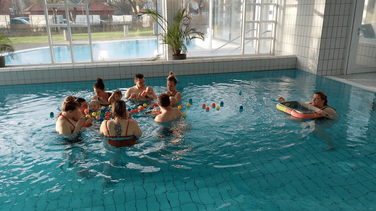 Entspannung, Spiel und Spaß für Eltern mit Kleinkindern in körperwarmen Wasser. Das Gefühl, sich in der Schwerelosigkeit des warmen Wassers entwickeln zu können, hat der Embryo noch im Bauch der Mutter als natürlichen Zustand erlebt und fördert nach der Geburt die weitere Entwicklung des zentralen Nervensystems. Leichte Dehnungen durch rhythmische Schwingungen mit der Fließbewegung und gegen den Wasserwiderstand, sowie stille Momente stärken das Urvertrauen und das eigene Körperempfinden. Alter der Kinder: 10 Monate bis 3 Jahre