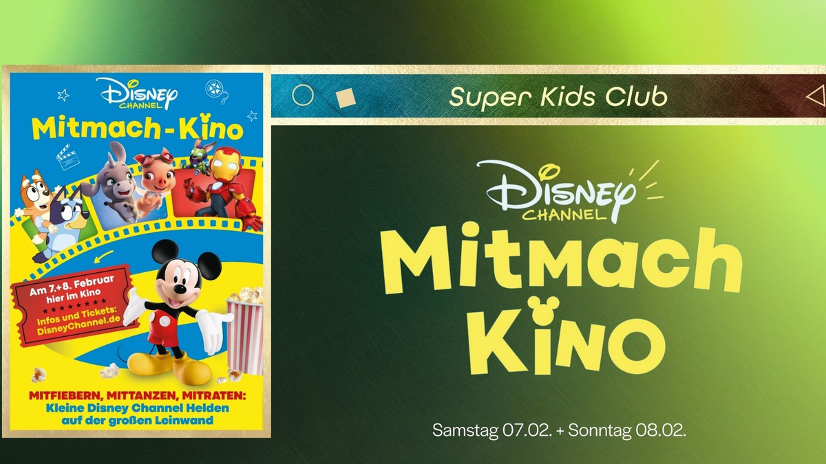 Buntes Programm, bei dem die Kinder dazu animiert werden, eine Stunde lang mitzusingen, zu tanzen und zu rätseln. Was ist das Disney Channel Mitmachkino und was gibt es dieses Mal zu sehen? Kino bedeutet Licht aus, Ruhe und Stillsitzen? Nicht beim Disney Channel Mitmach-Kino! Hier dürfen Kinder eine Stunde lang lautstark mitsingen, tanzen, klatschen und rätseln – eben alles, nur nicht leise sein! Auf der großen Leinwand führt Micky Maus als animierter Gastgeber die Kinobesucher durch das kunterbunte Programm, das auf die kleinsten Zuschauer im Vorschulalter ausgerichtet ist und ca. 60 Minuten kindgerechtes Mitmach-Kino bietet: Mitfiebern: Für Spannung sorgen tolle Geschichten von Bluey, Marvel Iron Man und seine fantastischen Freunde und der ganz neuen Vorschul-Serie MagiCampers. Außerdem gibt es mit lustigen Kurzgeschichten mit Winnie Puuh, Minnie und Cars viel zu lachen. Mittanzen: Musikvideos laden zum Mittanzen und Mitsingen ein und sorgen für Bewegung zwischen den Episoden. Mitraten: Bei kleinen Ratespielen rund um die Disney Channel Vorschul-Serien können die kleinen Besucher ihr Rätseltalent unter Beweis stellen. Wir freuen uns, wenn Sie mit dabei sind. Das Disney Channel Mitmachkino ist das beste Programm, um unsere Kinogäste von morgen schon heute für Kino zu begeistern.