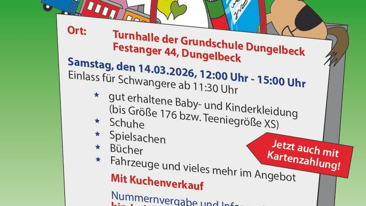Dungelbeck – Am Samstag, 14.03.2026, 12–15 Uhr findet wieder der beliebte Dungelbecker Kommissionsbasar „Rund ums Kind“ statt. In der Turnhalle der Grund-schule Dungelbeck (Festanger 44, 31226 Peine) gibt es Baby- und Kinderkleidung bis Größe XS, Kinderschuhe, Spielsachen, Bücher, Fahrzeuge und vieles mehr für kleines Geld. Nach der Schnäppchenjagd kann man sich mit leckerem Kuchen stärken. Schwangere mit einer Begleitperson dürfen bereits eine halbe Stunde vor dem offiziellen Einlass in Ruhe stöbern. Der Förderverein der Grundschule Dungelbeck sowie der Elternbeirat der Kinder-tagesstätte „Kinderparadies“ freuen sich auf einen erfolgreichen Herbstbasar. Die Erlöse aus Verkaufsgebühren und Kuchenverkauf kommen wieder beiden Einrich-tungen zugute. Anmeldung für Verkäufer ab 03.02.2026 per E-Mail: kinderbasar.dungelbeck@gmail.com