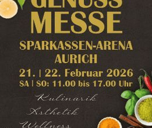 Am 21. und 22. Februar 2026 ist es wieder so weit – die Genussmesse – für ein gutes Lebensgefühl öffnet ihre Türen und verspricht ein Fest für die Sinne! Von 11:00 bis 17:00 Uhr erwartet euch in der Sparkassen-Arena Aurich eine Welt voller Geschmack, Inspiration und Wohlgefühl. Rund 90 Aussteller präsentieren raffinierte Köstlichkeiten, hochwertige und regionale Spezialitäten sowie ausgewählte Produkte und Dienstleistungen aus den Bereichen Kulinarik, Ästhetik und Wellness – zum Entdecken, Probieren und Genießen. Taucht ein in ein Wochenende voller Genuss und besonderer Erlebnisse!